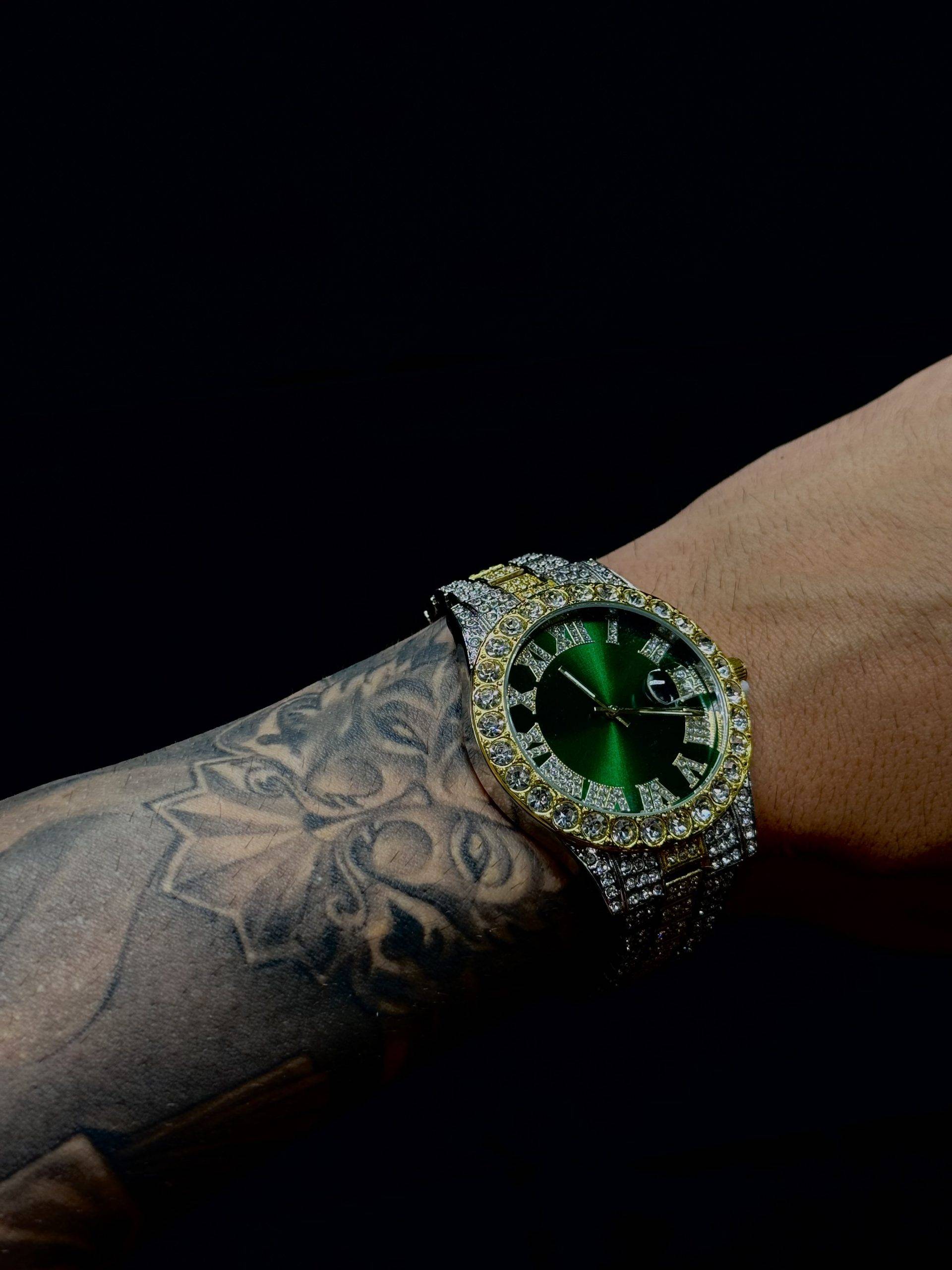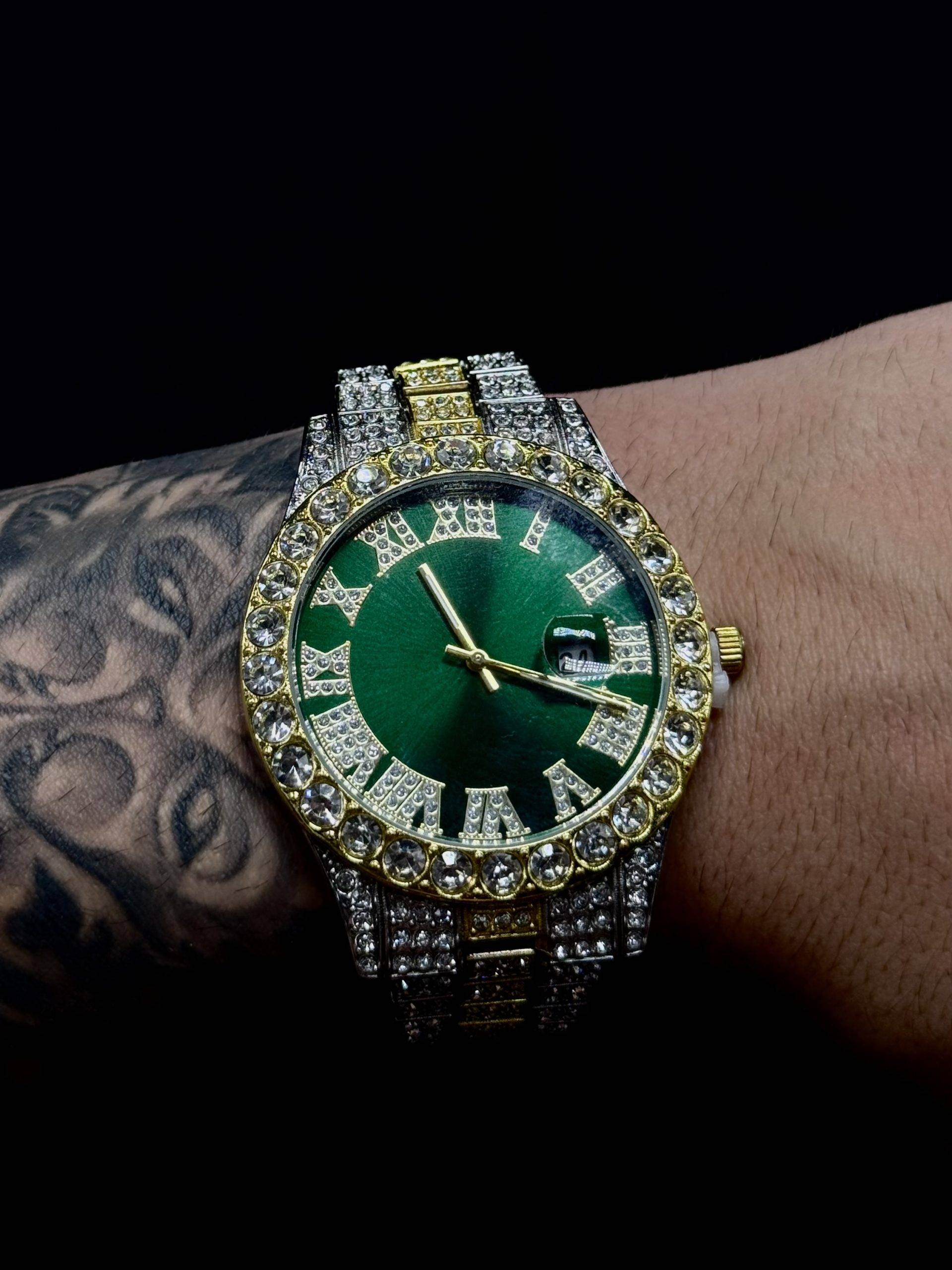 Reloj London Ice&Gold Color Green Enchapado en oro con Zirocnias!! Modelo Excluisvo de CobraJoyeria. Con malla ajustada sacando los pernos!!